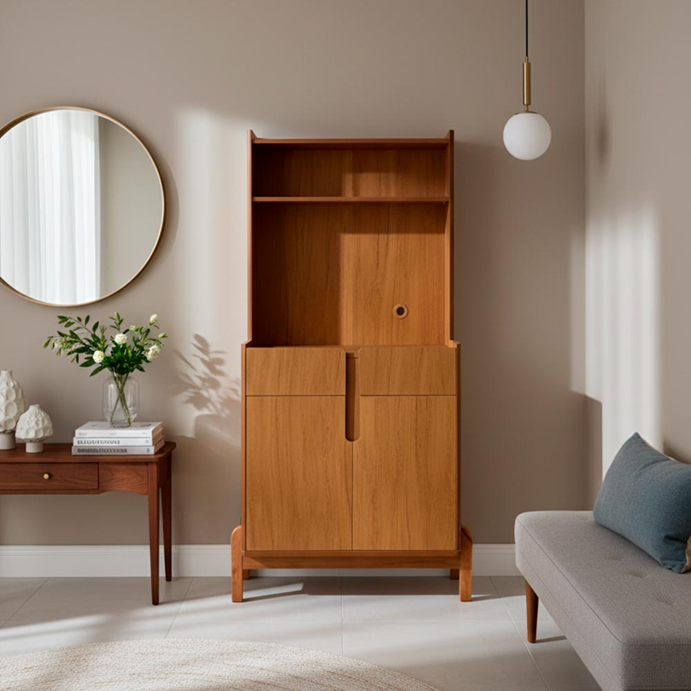 • Aparador o alacena de estilo Mid-Century Modern (moderno de mediados de siglo), caracterizado por sus líneas limpias y el uso de madera con tonos naturales. • Es una pieza funcional diseñada para organizar espacios como el comedor o la cocina, a menudo utilizada como estación de café o despensa. • Diseño: Estructura vertical con estanterías abiertas en la parte superior, cajones centrales y un armario con puertas batientes en la base. • Material: Fabricado en madera procesada (MDF) con acabados que imitan maderas naturales como el cedro o el roble. • Funcionalidad: Incluye espacios específicos para electrodomésticos pequeños como microondas o cafeteras, y estantes internos regulables para almacenamiento. • Requiere armado.