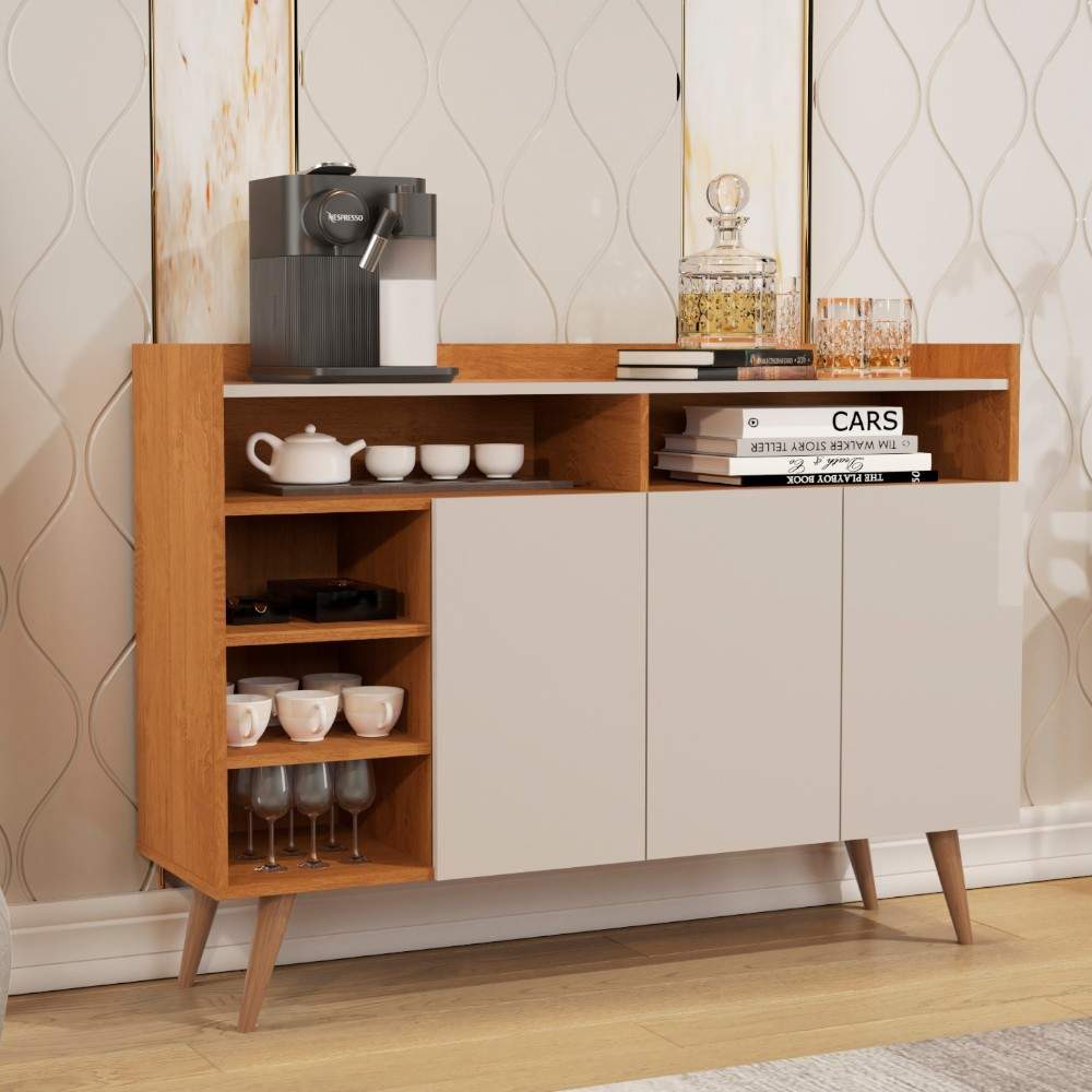 • Aparador Buffet de estilo retro diseñado frecuentemente para crear un "rincón del café" en el hogar. • Este modelo específico cuenta con tres puertas, estantes abiertos (nichos) para organización y patas estilo "palito". • Material: Fabricado principalmente en MDP y MDF con acabado mate. • Dimensiones: 120 cm de ancho, 35 cm de profundidad y una altura de 97 cm. • Configuración: Posee tres puertas con bisagras metálicas y tres estantes internos/externos para almacenamiento. • Requiere armado.