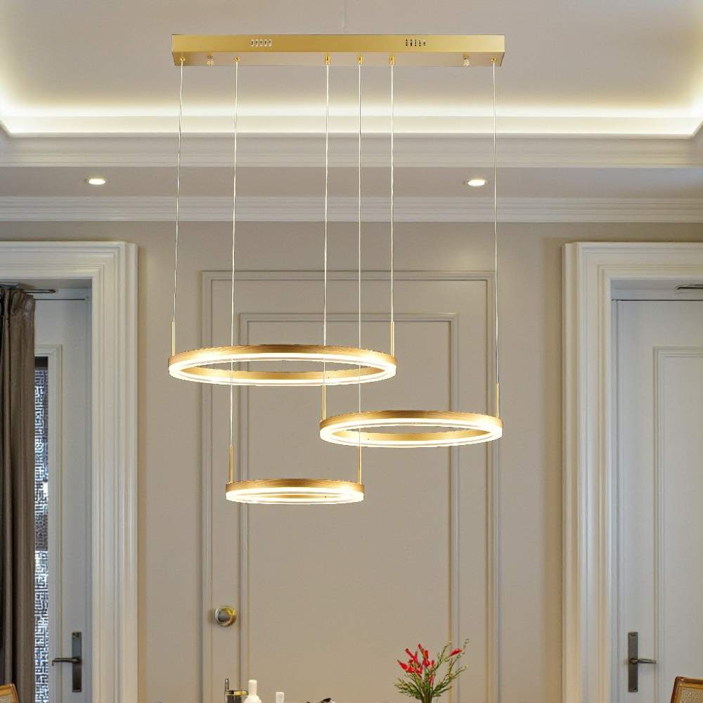 Moderna lámpara colgante LED con un diseño minimalista y elegante. La lámpara presenta un anillo luminoso de color dorado, suspendido por finos cables desde una base circular del mismo tono en el techo. El anillo emite una luz cálida, tiene una apertura en un lado, dándole una forma de C o de herradura incompleta. En Almacenes Marriott encuentras las mejores lámparas LED integradas en Ecuador, ideales para iluminar tu hogar, oficina o negocio con eficiencia, estilo y ahorro energético. Ofrecemos una amplia variedad de diseños modernos, alta durabilidad y tecnología de última generación que reduce tu consumo eléctrico. Compra online con total seguridad y recibe tu pedido en cualquier parte del país.