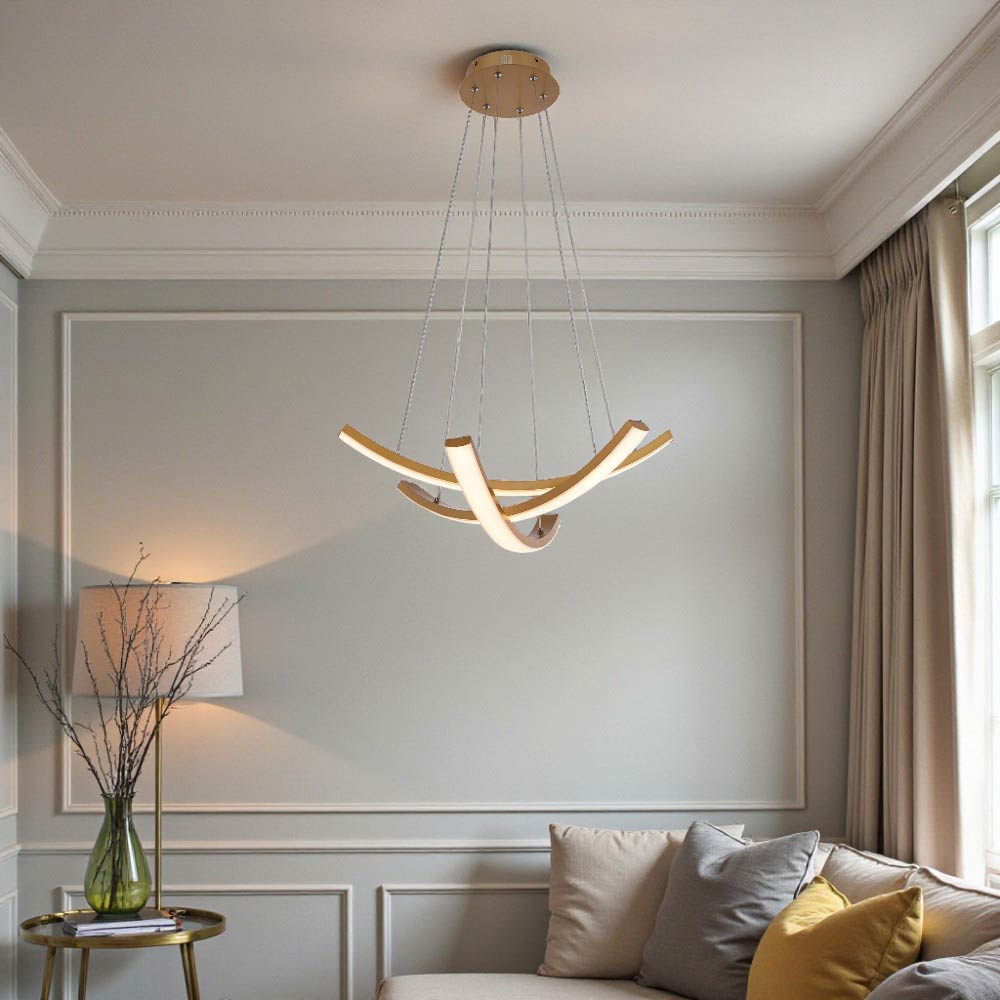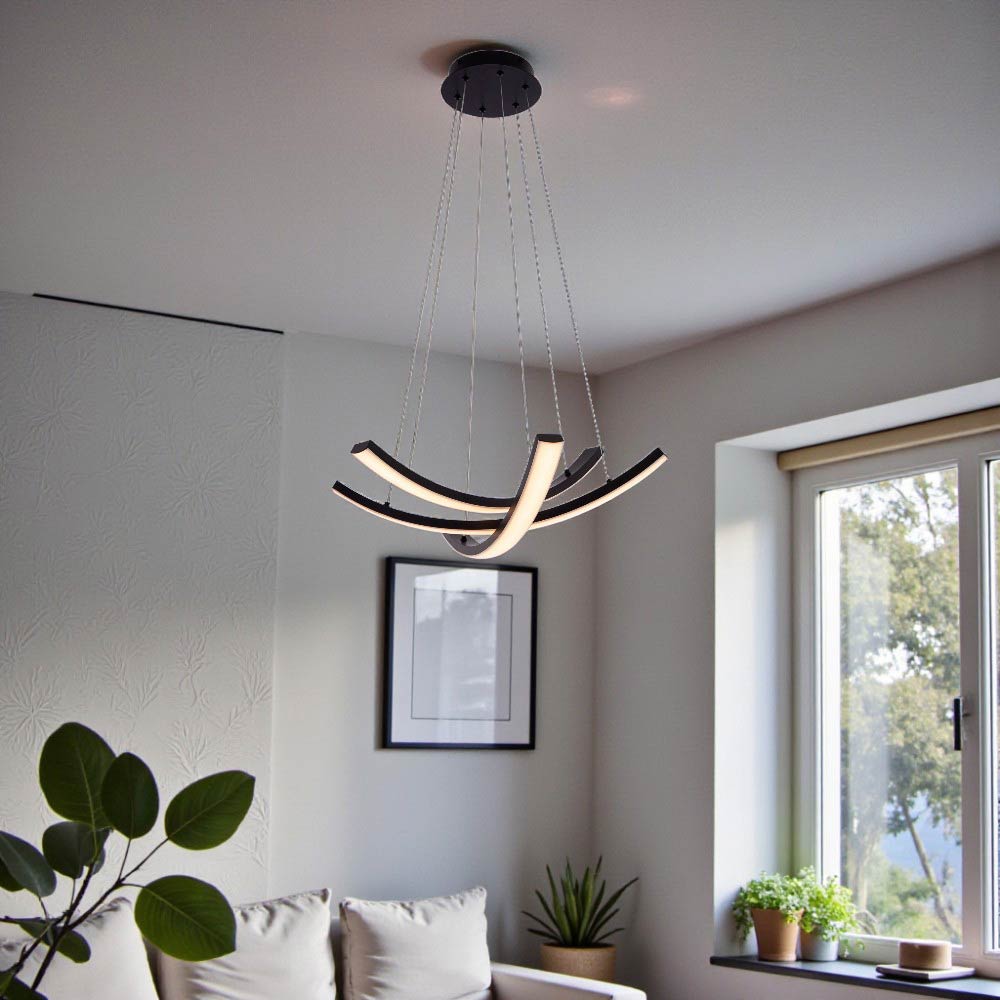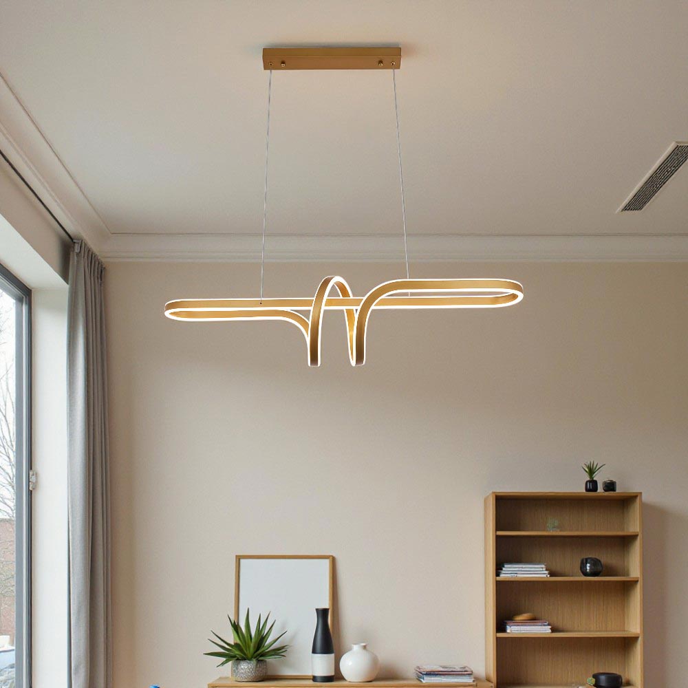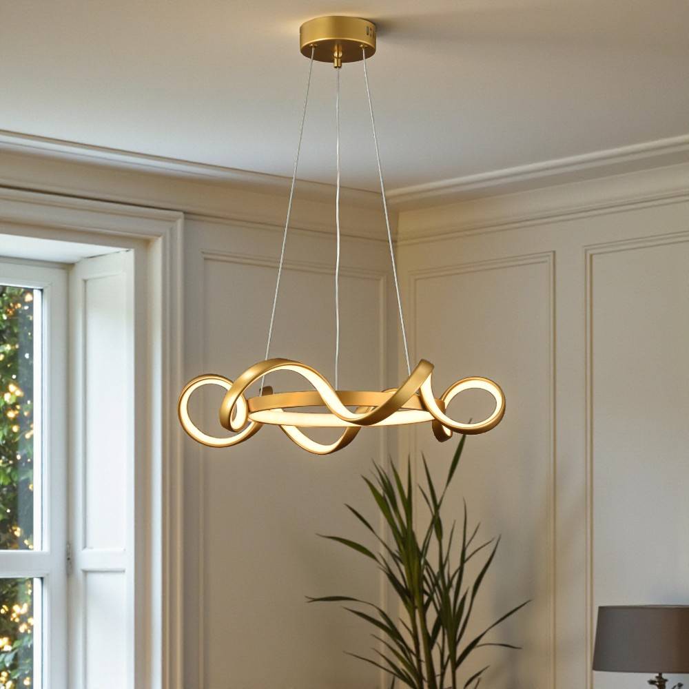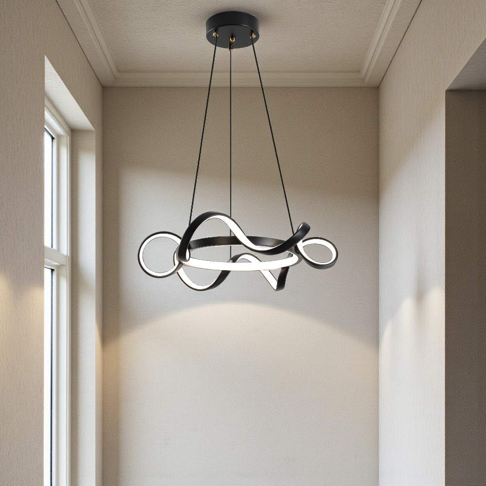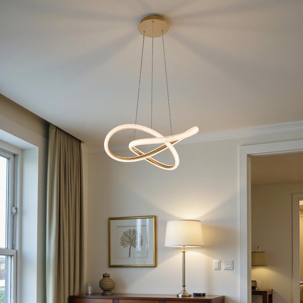 Lámpara colgante LED moderna con un diseño de espiral o cinta entrelazada. Presenta un diseño artístico y contemporáneo. Utiliza iluminación LED integrada, lo cual es eficiente energéticamente y de larga duración. Fabricada con una combinación de metal y acrílico o silicona para la cubierta difusora de la luz. Ofrece la posibilidad de ajustar la temperatura del color (luz cálida, neutra o fría) e incluso es regulable(dimables) mediante la app Dexel Smart, Smart Life o Tuya. Es ideal para añadir un punto focal decorativo y moderno en espacios interiores como salas de estar, comedores, dormitorios u oficinas.