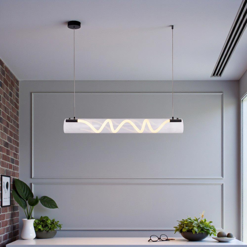 Lámpara colgante LED de diseño moderno y minimalista. Consiste en una estructura rectangular de metal negro que sostiene un tubo de luz LED horizontal, emitiendo una luz cálida. La lámpara está suspendida del techo mediante dos cables delgados y un soporte rectangular negro. Es un estilo comúnmente utilizado en espacios contemporáneos como comedores, oficinas o bares, destacando por su sencillez y funcionalidad. Cómprala online en Marriott.