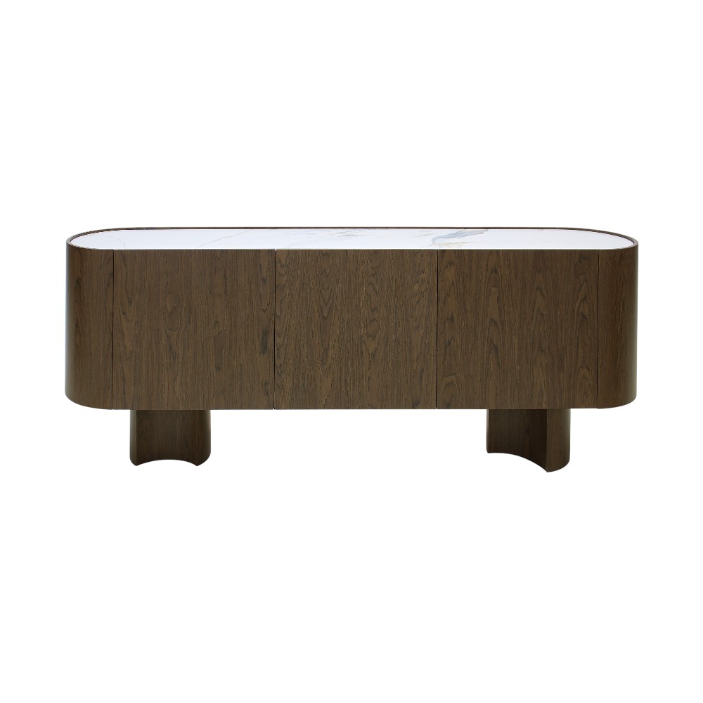 Consola de estilo moderno con un diseño elegante y contemporáneo. Cuenta con un top de cristal transparente, con una forma semicircular o de media luna que le confiere un aspecto distintivo. La base está elaborada con múltiples barras o listones de metal pulido, probablemente acero con acabado cromado o plateado, dispuestas verticalmente y curvadas en la parte inferior para formar una base sólida y estéticamente atractiva. Este diseño de la base le otorga un aspecto escultórico y reflectante. El conjunto de la mesa irradia un atractivo glamuroso y sofisticado, ideal para entradas, pasillos o como mesa auxiliar en salas de estar, ofreciendo un espacio para exhibir objetos decorativos o almacenar elementos esenciales.