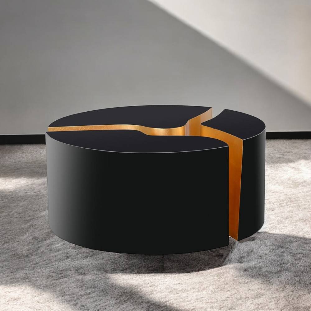 Mesa de centro redonda con un diseño moderno y distintivo. Presenta un acabado exterior en color negro mate y un interior o hendiduras en tonos dorados, creando un contraste llamativo. El diseño simula una forma agrietada o seccionada, donde las "grietas" revelan el color dorado subyacente, añadiendo un elemento visual único a la pieza.