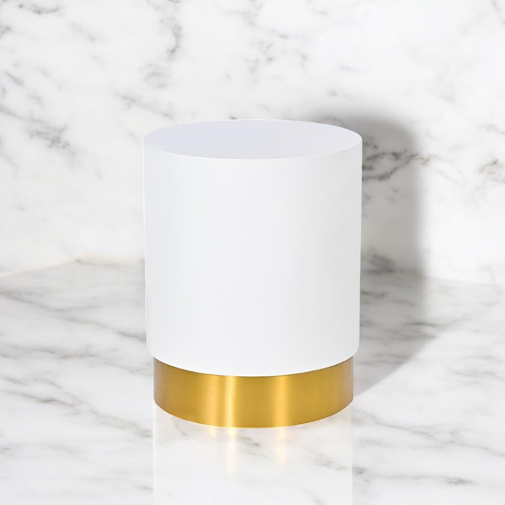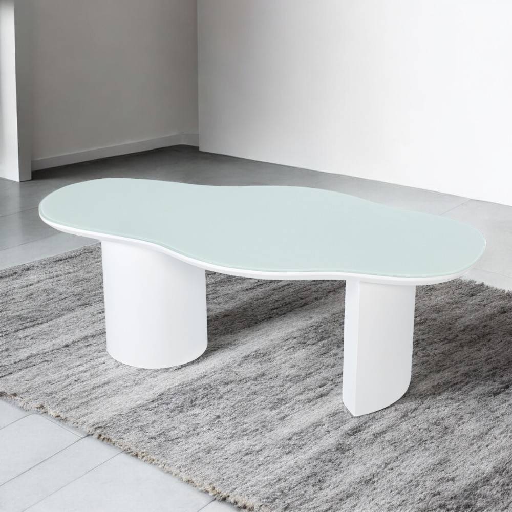 mesa de centro rectangular con un diseño moderno y distintivo. Presenta un acabado exterior en color blanco mate y un interior o hendiduras en tonos dorados, creando un contraste llamativo. El diseño simula una forma agrietada o seccionada, donde las "grietas" revelan el color dorado subyacente, añadiendo un elemento visual único a la pieza.