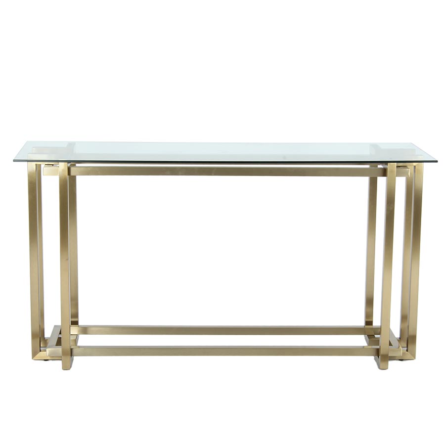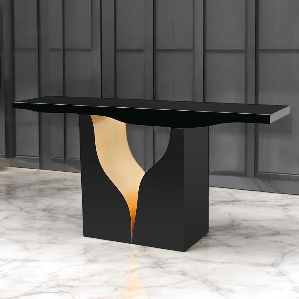 Consola de estilo moderno con un diseño elegante y contemporáneo. Cuenta con un top de cristal transparente, con una forma semicircular o de media luna que le confiere un aspecto distintivo. La base está elaborada con múltiples barras o listones de metal pulido, probablemente acero con acabado cromado o plateado, dispuestas verticalmente y curvadas en la parte inferior para formar una base sólida y estéticamente atractiva. Este diseño de la base le otorga un aspecto escultórico y reflectante. El conjunto de la mesa irradia un atractivo glamuroso y sofisticado, ideal para entradas, pasillos o como mesa auxiliar en salas de estar, ofreciendo un espacio para exhibir objetos decorativos o almacenar elementos esenciales.