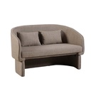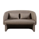 El sofá tiene una silueta de forma orgánica y diseño moderno curvo, está tapizado en tela y viene con dos cojines adicionales para soporte lumbar.