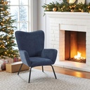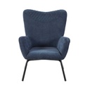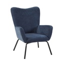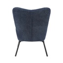 Butaca de diseño moderno en color azul oscuro. Presenta las siguientes características: La butaca está tapizada en una tela de poliéster de color azul oscuro, con un patrón acolchado en la parte superior del respaldo que le añade un toque distintivo. Diseño: Tiene un diseño de butaca con respaldo alto y reposabrazos integrados que se curvan suavemente hacia el asiento. Patas: Se apoya sobre cuatro patas de metal delgadas y angulares, pintadas en color negro, que le confieren un estilo contemporáneo e industrial. Comodidad: El relleno del sillón asegura una experiencia de asiento placentera, y su diseño ergonómico prioriza la comodidad y la postura. Dimensiones: Sus dimensiones la hacen adecuada para diversos espacios como salas de estar, dormitorios u oficinas.