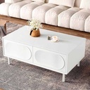 Mesa de centro de forma rectangular con patas cilíndricas cortas. En la parte frontal, presenta dos cajones con un diseño ovalado en relieve, que le otorgan un toque moderno y minimalista. El mueble tiene un acabado liso y uniforme, de estilo contemporáneo y limpio. Requiere Armado.