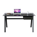 Escritorio moderno con una superficie de vidrio templado negro y patas de metal negras. El escritorio también incluye un cajón de almacenamiento integrado en un lateral. Requiere Armado.
