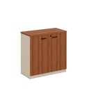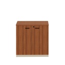 Modular de oficina bajo con dos compartimientos cerrados y un acabado que combina tonos claros y un tono tipo madera. El modular tiene una superficie superior de color madera, puertas frontales con textura de madera veteada en un tono café, tiradores oscuros y una base clara, posiblemente blanca o beige. Incluye una cerradura cilíndrica con llaves. Requiere Armado.