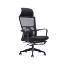 Silla ejecutiva ergonómica de oficina, de color negro, con varias características diseñadas para la comodidad y el soporte durante largas jornadas. Respaldo alto de malla: Favorece la ventilación y el soporte lumbar. Asiento de tela: Proporciona comodidad. Reposapiés extensible: Permite una posición reclinada y relajada. Base giratoria con ruedas: Facilita la movilidad en el espacio de trabajo. Mecanismo multifuncional: Incluye ajuste de bloqueo y pistón de gas para regular la altura. Descansabrazos fijos: Ofrecen soporte adicional. Requiere Armado.