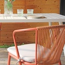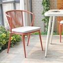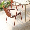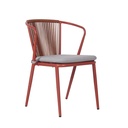 Silla de comedor con brazos con estructura de metal en tono rojizo o terracota y un respaldo con un entramado de cuerda o material similar. Incluye un cojín de asiento de color gris claro. Su diseño combina elementos modernos con un toque rústico en el respaldo trenzado, y es adecuada tanto para uso interior como exterior.