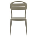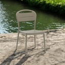 Silla de exterior sin brazos, de diseño moderno y color arena o gris claro. Está fabricada en aluminio, lo que la hace adecuada para uso en exteriores. Su diseño es apilable, lo que facilita su almacenamiento y optimización del espacio. El respaldo tiene un diseño curvo con dos ranuras horizontales y el asiento es plano con líneas horizontales, lo que sugiere un diseño ergonómico. Las patas son rectas y delgadas, a juego con el color de la silla. Las sillas y mesas de alto tráfico, están diseñadas para entornos como restaurantes, oficinas y áreas de espera, combinan durabilidad, funcionalidad y estética. Almacenes Marriott es la tienda online líder en Ecuador en decoración.