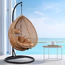 Silla colgante popular para interiores y exteriores. Está diseñada para proporcionar un lugar cómodo y relajante. Fabricada con mimbre de polietileno (ratán sintético) tejido a mano sobre un robusto marco de acero para resistir la intemperie y los rayos UV. Cuenta con una canasta en forma de huevo con un patrón calado transpirable, cojines acolchados gruesos y una base metálica con soporte de cadena para colgar de forma segura. Su diseño la hace adecuada para una variedad de espacios, incluyendo dormitorios, salas de estar, patios, jardines y balcones. El soporte de base de cuatro patas proporciona estabilidad y seguridad, evitando que se balancee excesivamente.