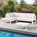 Conjunto de muebles de exterior de color blanco, compuesto por un sofá esquinero y una mesa de centro. La estructura es de aluminio con pintura electrostática en blanco mate, lo que le da una apariencia moderna y atemporal. Los cojines son de color blanco, desenfundables e impermeables, diseñados para resistir la humedad y los rayos UV del sol. El tejido de los cojines es de poliéster. El conjunto está diseñado para jardines, terrazas o patios, combinando estética y comodidad. Es resistente al agua y fácil de limpiar. Requiere armado. Cómpralo ya en Almacenes Marriott, la tienda online líder en Ecuador en decoración.