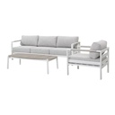 Juego de sala para exteriores de aluminio. El conjunto incluye un sofá de tres plazas, un sillón individual y una mesa de centro a juego. Material y Color: El conjunto está construido con un marco de aluminio con recubrimiento en polvo de color blanco, conocido por ser resistente a la oxidación y a la intemperie. Cojines: Los cojines son de color gris claro, con un generoso acolchado de espuma de alta densidad para mayor comodidad. Son repelentes al agua y resistentes a los rayos UV. Mesa de Centro: La mesa de centro a juego presenta una superficie con un acabado de imitación madera, que es duradera y fácil de limpiar. Diseño: El diseño es moderno y minimalista, con líneas limpias y reposabrazos amplios, ideal para espacios exteriores como patios o jardines.