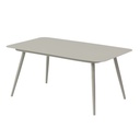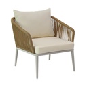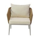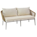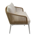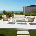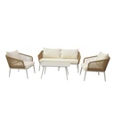 Conjunto de muebles de exterior para jardín o terraza, compuesto por cuatro piezas: Un sofá de dos plazas con estructura de aluminio en color claro y respaldo y reposabrazos elaborados con cuerda sintética trenzada en tono beige o natural. Incluye cojines acolchados en color crema para el asiento y el respaldo. Dos sillones individuales a juego con el sofá, presentan la misma estructura de metal o aluminio, respaldo y reposabrazos de cuerda sintética trenzada, y cojines en color crema para el asiento y el respaldo. Una mesa de centro rectangular con una estructura de metal o aluminio en color claro y una superficie lisa, también en un tono claro. Almacenes Marriott es la tienda online líder en Ecuador en decoración.