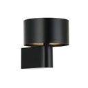 Lámpara de pared moderna de color negro. Presenta un diseño minimalista con una base rectangular que se adhiere a la pared y un cuerpo cilíndrico del que emerge una pantalla redonda, también en color negro, que cubre la fuente de luz LED integrado. La pantalla ayuda a que la luz sea indirecta creando un ambiente cálido y acogedor.