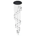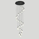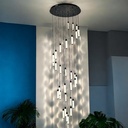 Lámpara de araña o lámpara colgante de estilo moderno y minimalista. Presenta una base circular oscura de la que cuelgan múltiples luces tubulares de color claro, dispuestas en diferentes longitudes para crear un efecto de espiral o cascada. Los cables que sostienen las luces son finos y oscuros, contrastando con los cuerpos de las luminarias que emiten una luz suave.