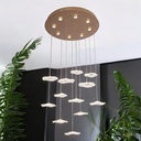 Lámpara colgante moderna con múltiples luces. Presenta una base circular de color dorado, de la cual descienden 12 cables delgados. En el extremo de cada cable hay una pequeña pantalla individual de forma ondulada o irregular, de color blanco translúcido, que emite luz. La lámpara tiene un diseño escalonado, con las pantallas ubicadas a diferentes alturas, creando un efecto visual dinámico y decorativo, ideal para iluminar y embellecer un espacio.