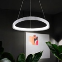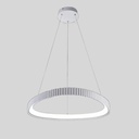 Lámpara colgante LED moderna de diseño circular. Presenta un diseño circular o de aro, con una estructura que cuelga del techo mediante cables finos. El aro tiene una superficie exterior con un patrón estriado o acanalado, mientras que la parte inferior del aro es lisa y emite luz. Incorpora tecnología LED, lo que la hace eficiente en el consumo de energía. Está fabricada con aluminio y acrílico. Su estética es moderna y sofisticada, adecuada para diversos ambientes interiores.