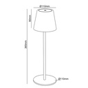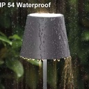 - Lámpara de mesa inalámbrica recargable con interruptor táctil. Ideal para dormitorios, hoteles, salas de estar y restaurantes ya que tiene un grado de protección IP54 (apta para exteriores bajo techo). - Cuenta con luz led integrada de 4000K (temperatura neutra) dimerizable y RGB (multicolor). - Incluye cable de 1m USB C para cargarla. - Tiempo de carga: 3 horas. - Duración de la carga: 6 horas en máximo lumen hasta 12 horas en bajo lumen.