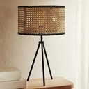 Lámpara de mesa con un diseño rústico y elegante. Posee una base de trípode en color negro, lo que le confiere estabilidad y un toque moderno. La pantalla es de ratán, un material que permite que la luz se filtre a través de sus pequeños orificios, creando un efecto de luz cálido y atmosférico. El diseño general de la lámpara combina elementos rústicos con un toque de lujo, haciéndola versátil para diversos espacios como salas de estar, dormitorios o incluso hoteles.