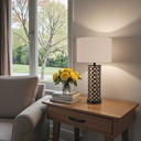 Lámpara de mesa Scott Living de 28 pulgadas con acabado bronce/oro y pantalla de tela neutra. La base presenta una textura rica con un diseño geométrico calado. Es ideal para añadir un toque de estilo sofisticado a la sala de estar o el estudio. Requiere foco.