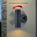 Moderna luminaria de pared bidireccional tipo up&down apta para exteriores. Requiere 2 focos de base GU10 los cuales se venden por separado.