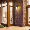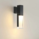 Aplique de pared moderno de color negro con luz LED integrada en la parte superior que permite la selección de la temperatura de luz (cálida, fría o neutra). El módulo de luz está cubierto por difusor transparente de acrílico facilitando la emisión de luz. El diseño es rectangular y minimalista, lo que lo hace adecuado para una variedad de espacios, incluyendo exteriores como porches, patios o pasillos.