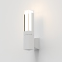 Aplique de pared moderno de color blanco con luz LED integrada en la parte superior que permite la selección de la temperatura de luz (cálida, fría o neutra). El módulo de luz está cubierto por difusor transparente de acrílico facilitando la emisión de luz. El diseño es rectangular y minimalista, lo que lo hace adecuado para una variedad de espacios, incluyendo exteriores como porches, patios o pasillos.