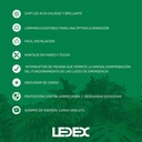 Las lámparas de emergencia Ledex se activan de manera automática cuando ocurre una falla en el suministro eléctrico. Funcionan con batería interna. Su luz led emite una luminosidad de la potencia necesaria para realizar una evacuación y son de bajo consumo. Se deben instalar de forma que señalen el camino hacia las salidas de evacuación. Requieren un punto eléctrico. ESPECIFICACIONES Y CARACTERÍSTICAS Plástico ABS resistente al fuego Tiempo de Carga en 24 horas Respaldo de 90 minutos Protección Contra sobrecargas y Contra descargas excesivas Batería NiCd 3.6V Recargable Modo de emergencia: Cambio Automático en 0.2 seg Indicador de señalización de carga Interrumpor de prueba para comprobar el funcionamiento Multi instalación: Pared y Techo Rango de iluminación 80m2 Aislamiento Tipo II Curva fotometrica disponible