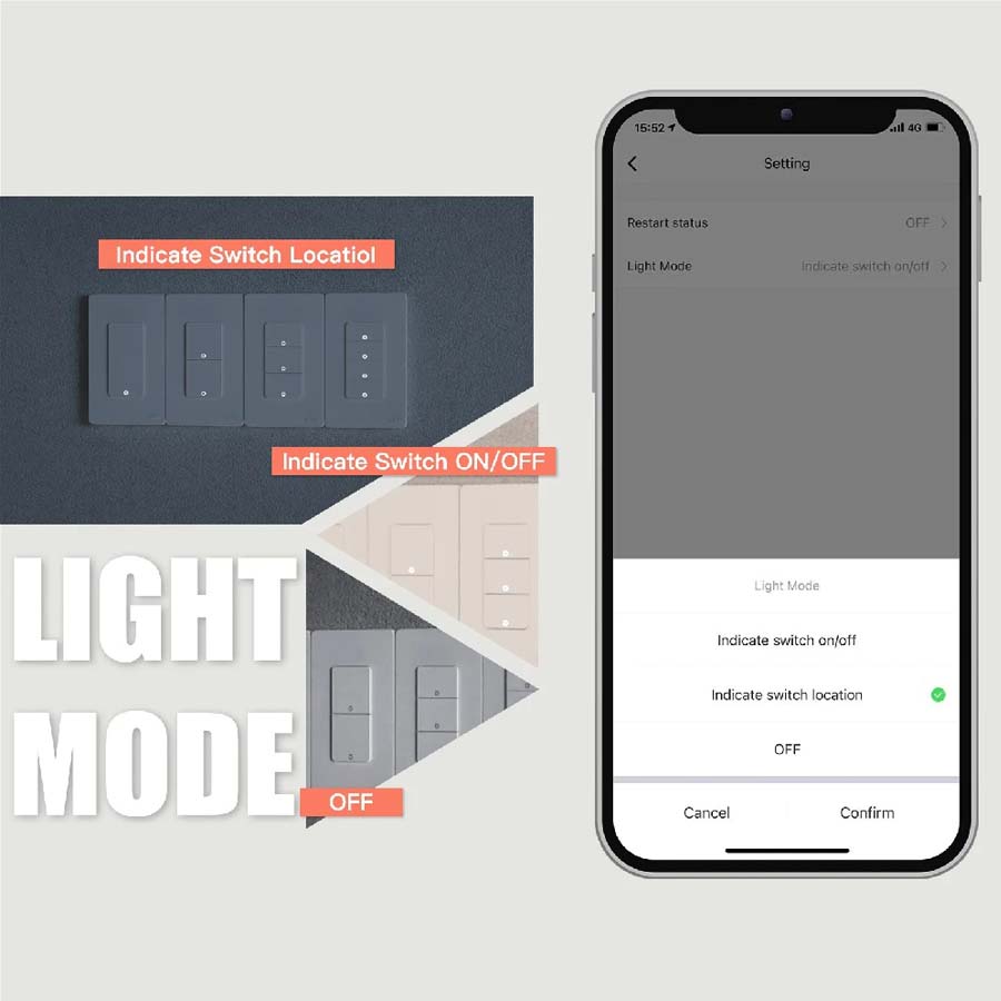 Interruptor de luz inteligente WiFi, botón pulsador de dos polos, funciona con Alexa, Google Home, se requiere cable neutro. 1. Personaliza tu horario: Configura temporizadores para conectar automáticamente los dispositivos de acuerdo con tu horario y preferencias diarias. Disfruta de la comodidad de tener sus dispositivos encendidos y apagados en momentos específicos sin intervención manual. 2. Modo de iluminación ajustable: Elige entre varios modos de iluminación para indicar el estado del dispositivo, la posición del interruptor o simplemente apaga la retroiluminación para un aspecto elegante. 3. Control remoto/por voz: Toma el control de sus luces desde cualquier lugar con la aplicación, eliminando las limitaciones de distancia. Con Compatibilidad de control por voz (Alexa, Google Home, etc.), manda fácilmente interruptores inteligentes con comandos de voz simples. 4. Compartir en familia: Comparte el acceso a los interruptores con los miembros de su familia.