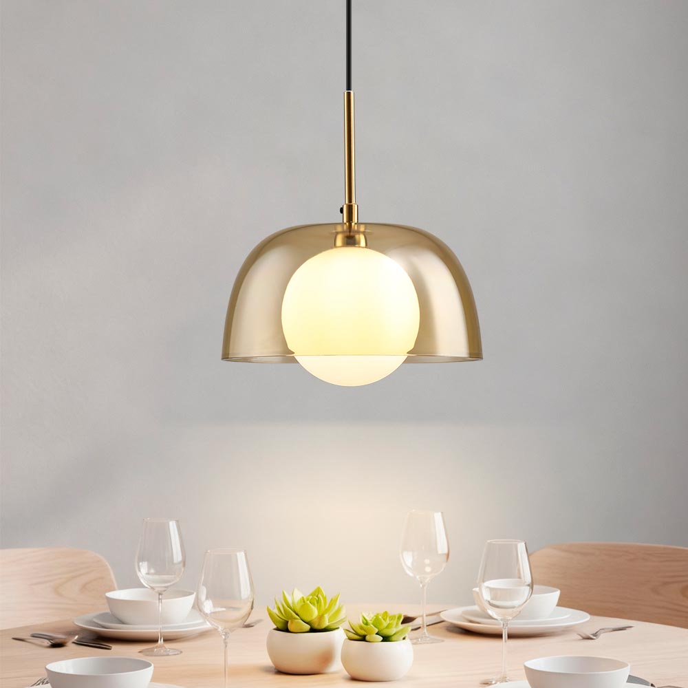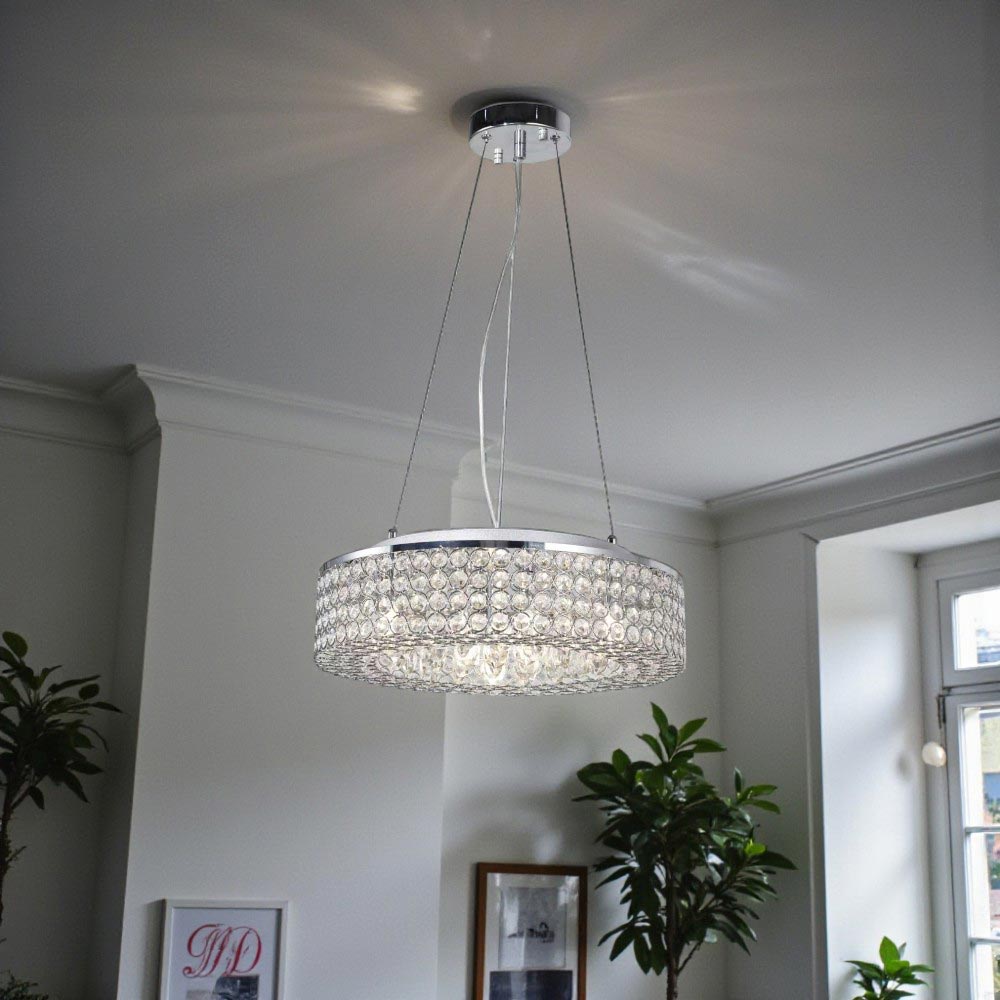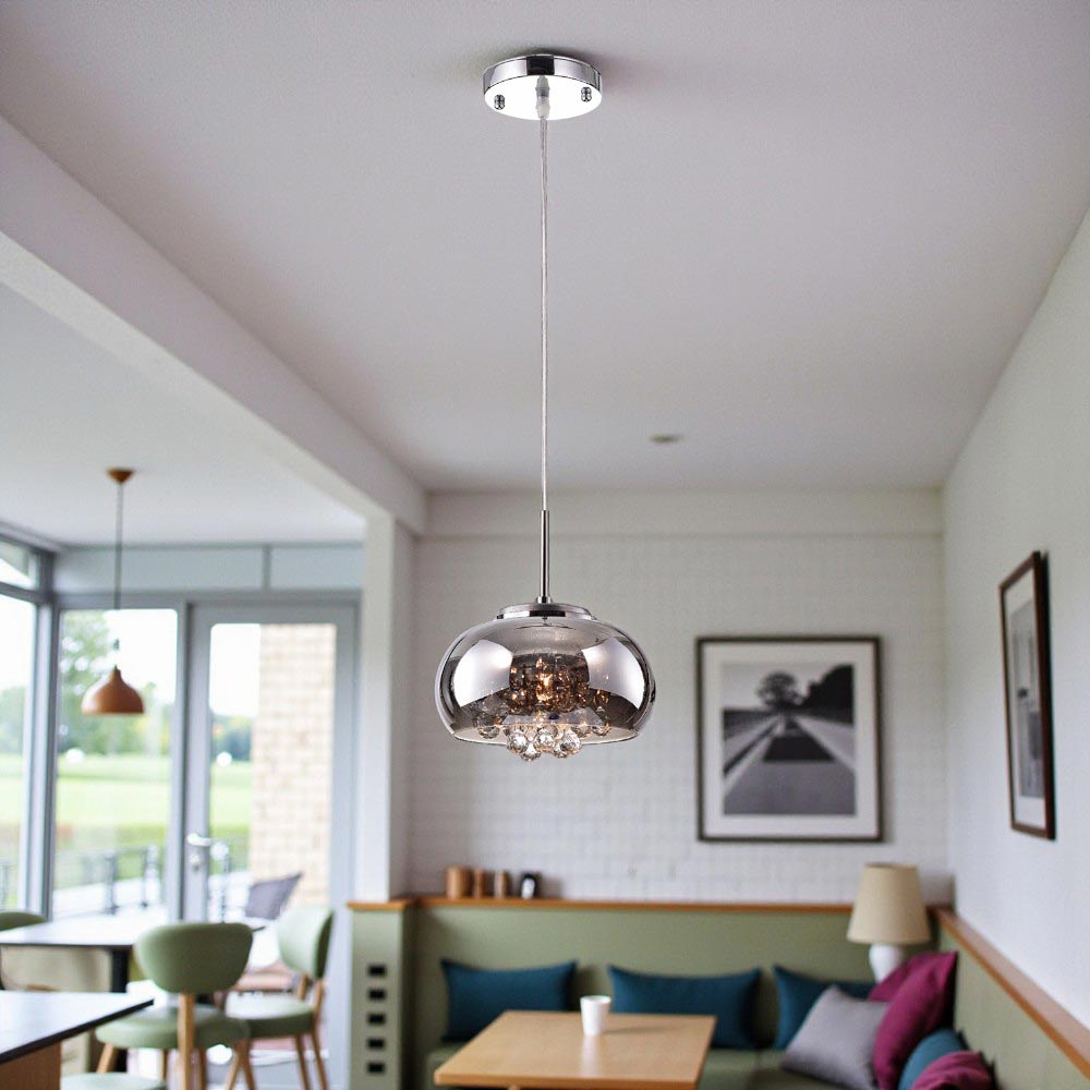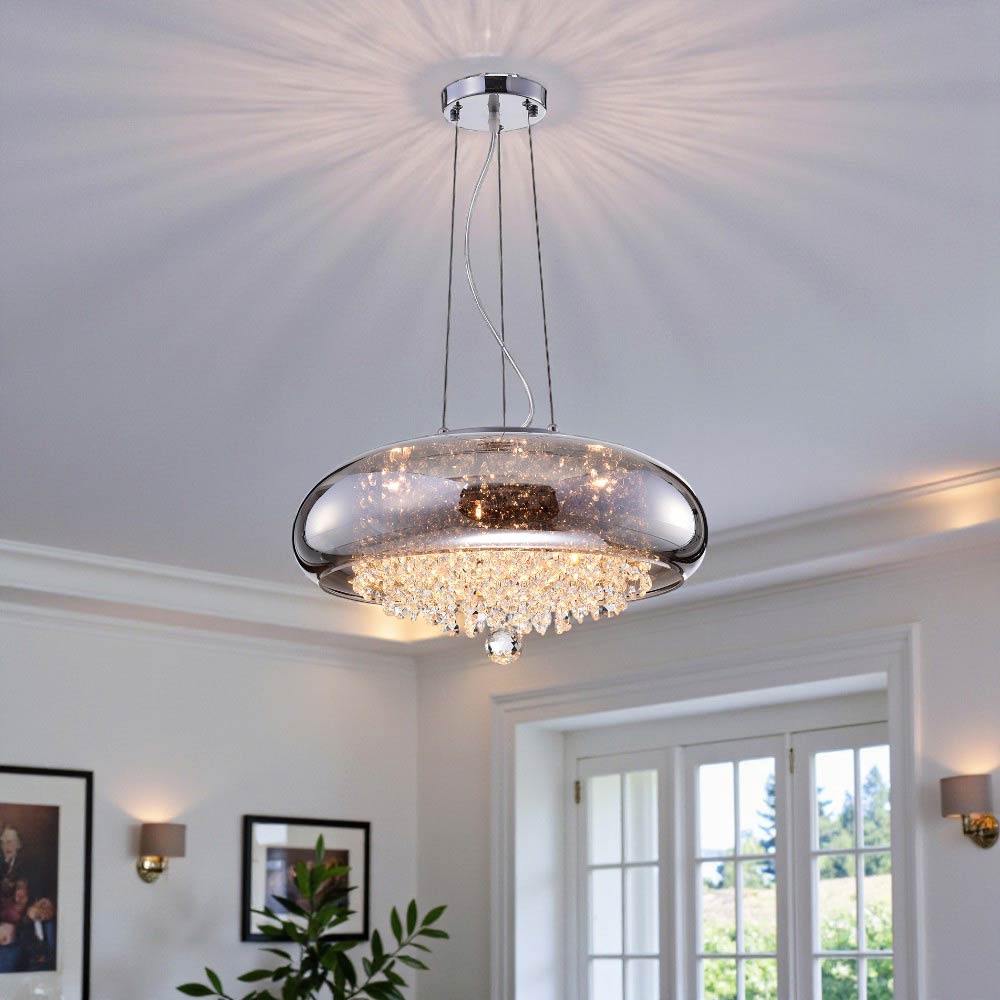 Lámpara en acabados cromados, transparentes y ámbar. Estilo: Contemporáneo, con un diseño Soho que combina modernidad y sofisticación. Fabricada con metal de alta calidad, cristal y vidrio. Puede ser instalado como lámpara colgante o como plafón, adaptándose a diversos ambientes interiores como salas de estar, comedores o livings.