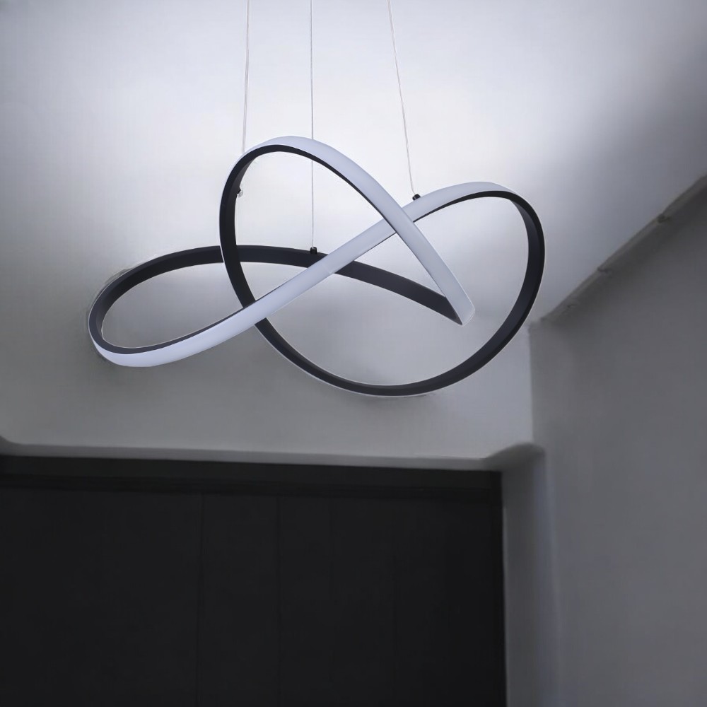 Lámpara de techo LED moderna y decorativa. Presenta un diseño abstracto y fluido, con formas curvas entrelazadas que crean un efecto visual dinámico, similar a un nudo o un símbolo de infinito. La lámpara es de color negro mate y cuenta con iluminación LED integrada a lo largo de sus contornos, emitiendo una luz cálida que resalta su forma y añade un toque elegante al ambiente.