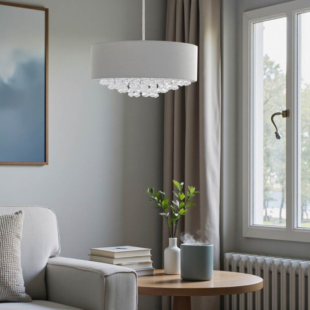 Lámpara de mesa de vidrio con detalles dorados. Presenta una silueta clásica de lágrima de vidrio transparente, modernizada con detalles de pan de oro en la base. Pantalla: Cuenta con una pantalla de tambor rígida de algodón 100% en color blanco. Detalles adicionales: Incluye un cable forrado en seda y un remate de cristal. El interruptor de encendido y apagado se encuentra en el portalámparas. Lámpara de las marcas Craftmade y Scott Living by Drew & Jonathan, 2 diseñadores reconocidos en USA por diseñar mobiliario, decoración, lámparas y textiles. La colección Scott Living ofrece estilos modernos, clásicos e industriales, y busca ofrecer lujo accesible para todos los hogares.