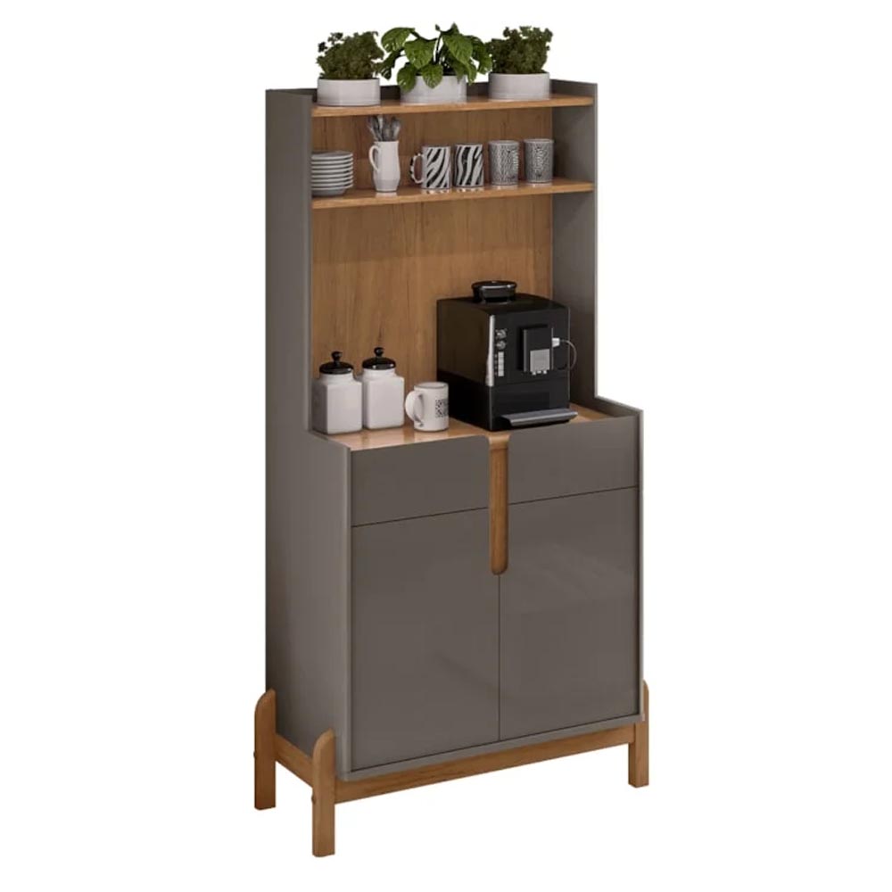 • Aparador o alacena de estilo Mid-Century Modern (moderno de mediados de siglo), caracterizado por sus líneas limpias y el uso de madera con tonos naturales. • Es una pieza funcional diseñada para organizar espacios como el comedor o la cocina, a menudo utilizada como estación de café o despensa. • Diseño: Estructura vertical con estanterías abiertas en la parte superior, cajones centrales y un armario con puertas batientes en la base. • Material: Fabricado en madera procesada (MDF) con acabados que imitan maderas naturales como el cedro en combinación con el gris. • Funcionalidad: Incluye espacios específicos para electrodomésticos pequeños como microondas o cafeteras, y estantes internos regulables para almacenamiento. • Requiere armado.