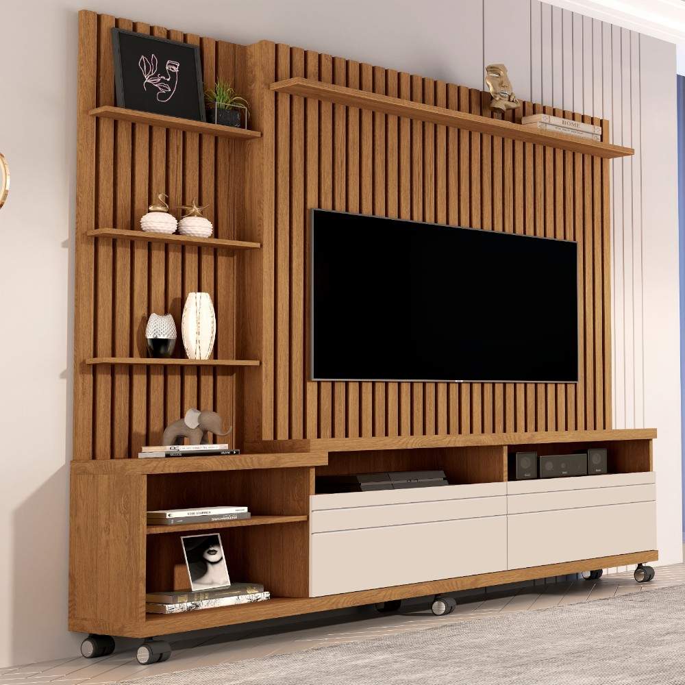 • Este mueble es un centro de entretenimiento diseñado para televisores de gran tamaño. • Presenta una combinación de colores Off White (blanco roto) y Freijó (un tono de madera natural), con detalles ripados en el panel y un rack inferior con ruedas para facilitar su movimiento. • Capacidad: Diseñado para televisores de hasta 70 o 72 pulgadas. • Dimensiones aproximadas: Suele medir unos 2,17 m de ancho, 1,97 m de alto y 45 cm de profundidad. • Almacenamiento: Incluye dos puertas laterales con bisagras metálicas, nichos centrales para dispositivos electrónicos y tres repisas superiores para decoración. • Material: Fabricado principalmente en MDP/MDF con acabado de pintura UV y texturas en alto relieve. • Marriott S.A. no realiza ningún tipo de instalación en pared. Por este motivo, los muebles de TV que requieren fijación o montaje en pared no se incluyen en el Servicio de Armado por parte de nuestro equipo. Agradecemos su comprensión y recomendamos coordinar la instalación con un técnico especializado para garantizar una correcta y segura colocación del mueble.
