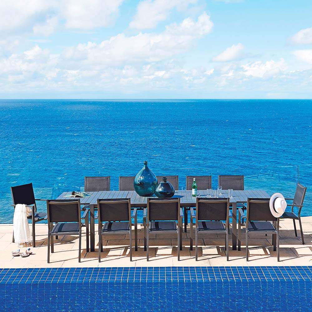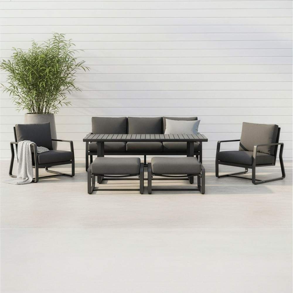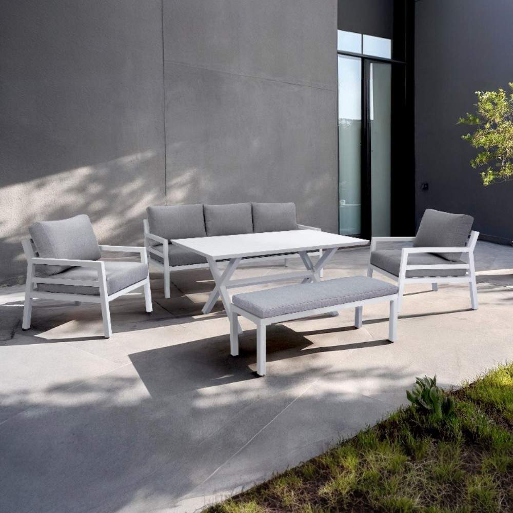 El conjunto de exterior Lucca ofrece un diseño elegante y contemporáneo, perfecto para disfrutar del aire libre con estilo. Cuenta con una robusta estructura de aluminio con recubrimiento en polvo, líneas depuradas y acabado mate. Sus cojines mullidos y profundos brindan una comodidad y durabilidad excepcionales, haciendo de este set el lugar ideal para relajarse o recibir invitados con estilo. - Material de las patas: Aluminio - Tipo de tela de los cojines: Poliéster, Textilene - Peso máximo permitido: Mesa: 50kg Sillón doble: 120kg Sillón triple: 360kg Ottoman: 30kg - Requiere armado