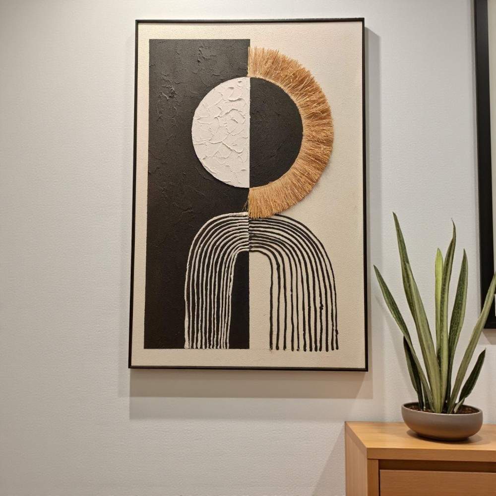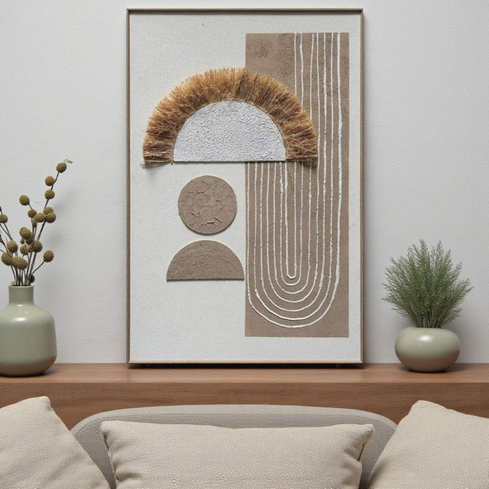 Obra de arte de pared enmarcada que presenta un estilo bohemio o "boho". Este estilo se caracteriza por una combinación de texturas, colores terrosos y elementos naturales para crear un ambiente relajado y acogedor. El diseño abstracto incluye formas geométricas, como un semicírculo y un círculo, junto con líneas verticales y curvas. Utiliza una paleta de colores neutros y terrosos, con tonos de beige, marrón y blanco. Se aprecian diferentes texturas, como la de las cerdas de una escoba en la parte superior, que es un rasgo común en el arte boho. El estilo boho en la decoración de interiores se inspira en un espíritu libre y bohemio, y a menudo incorpora elementos como textiles étnicos y plantas.