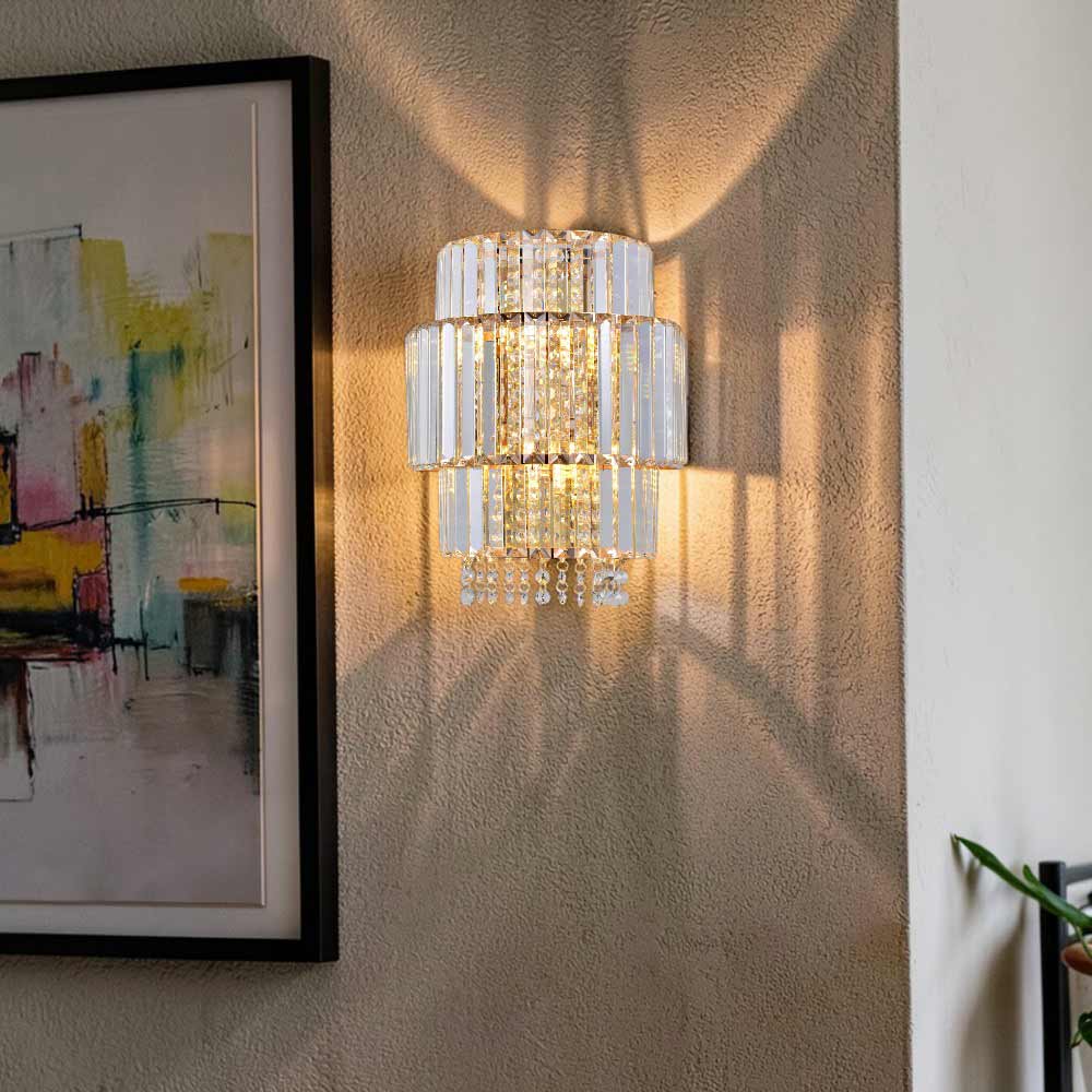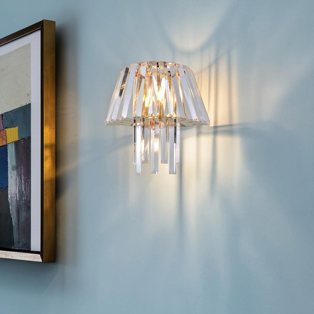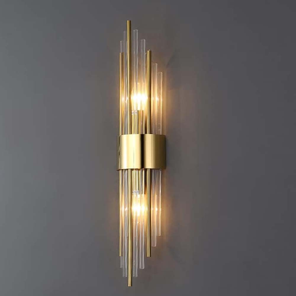 Elegante lámpara de pared elaborada de vidrio con detalle metálico. Ideal para iluminar pasillos, veladores, baños sociales y consolas. Requiere 2 focos de base E14 los cuales se venden con separado.