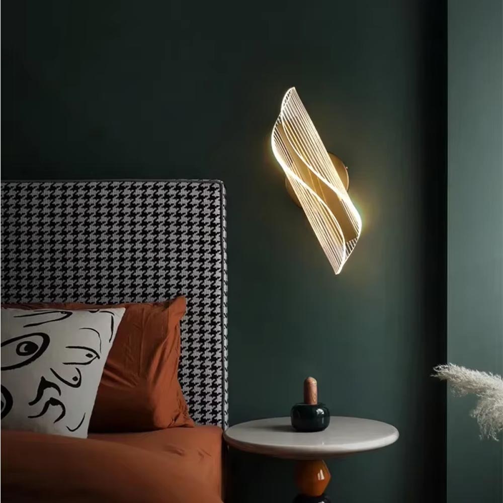 Lámpara LED de pared con un diseño moderno y minimalista. Presenta una forma abstracta y fluida, similar a un lazo o un infinito, con una base redonda que se adhiere a la pared. La estructura principal es de color negro mate, y la tira de luz LED integrada emite una luz cálida. Es una lámpara diseñada para proporcionar iluminación y ser un elemento decorativo en espacios interiores.