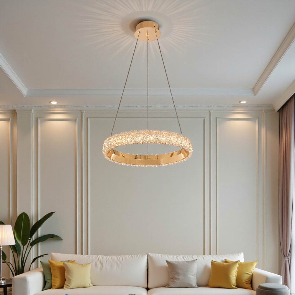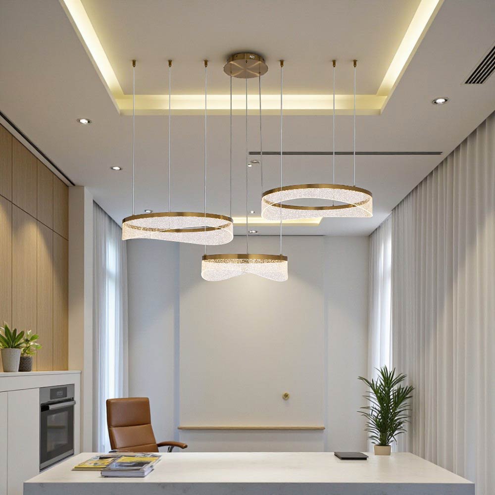 Moderna lámpara colgante LED con un diseño minimalista y elegante. La lámpara presenta un anillo luminoso de color dorado, suspendido por finos cables desde una base circular del mismo tono en el techo. El anillo emite una luz cálida, tiene una apertura en un lado, dándole una forma de C o de herradura incompleta. En Almacenes Marriott encuentras las mejores lámparas LED integradas en Ecuador, ideales para iluminar tu hogar, oficina o negocio con eficiencia, estilo y ahorro energético. Ofrecemos una amplia variedad de diseños modernos, alta durabilidad y tecnología de última generación que reduce tu consumo eléctrico. Compra online con total seguridad y recibe tu pedido en cualquier parte del país.