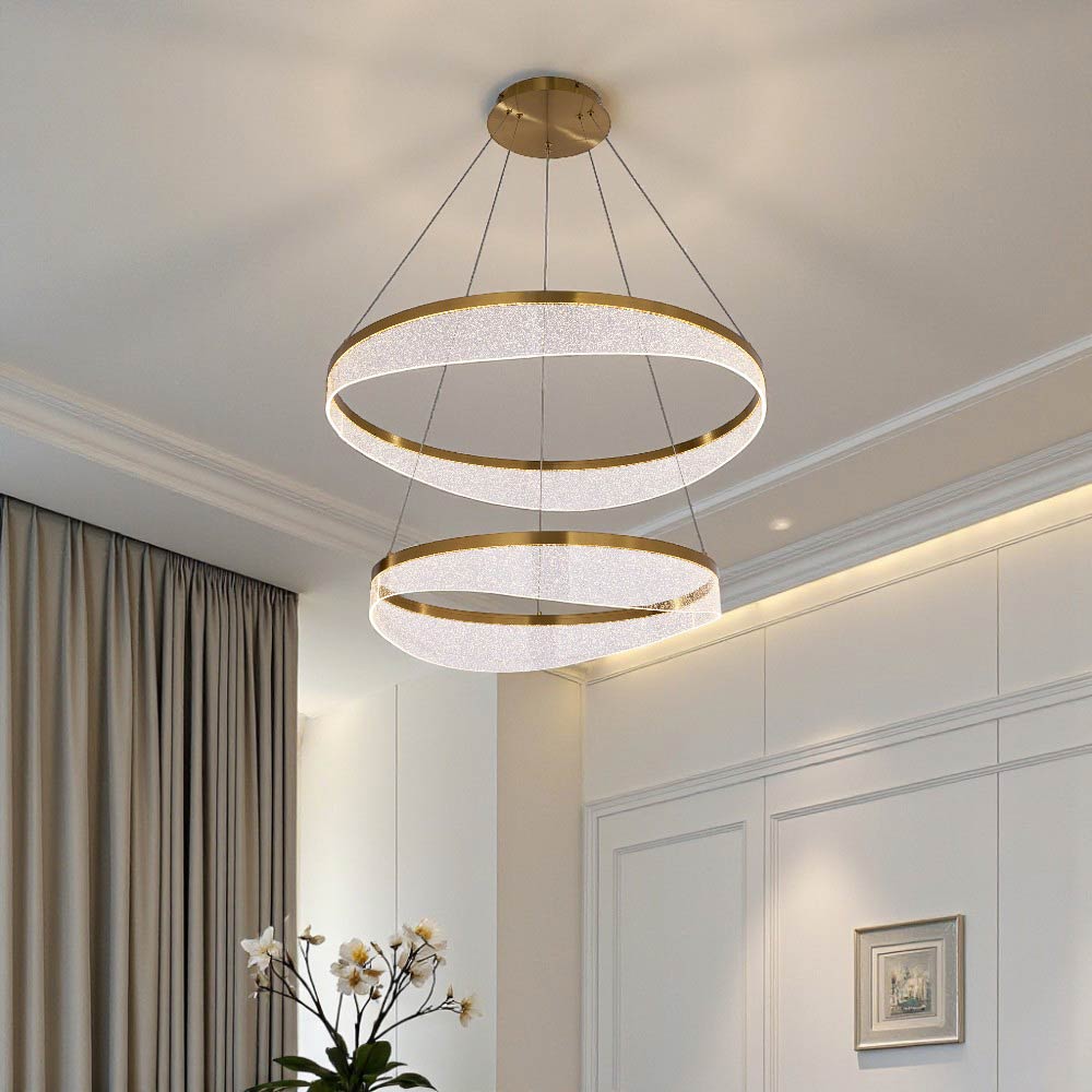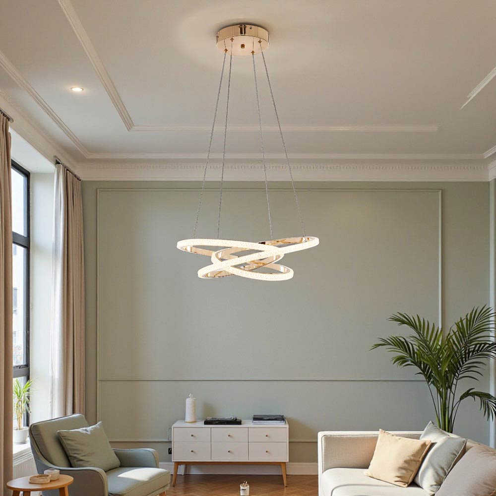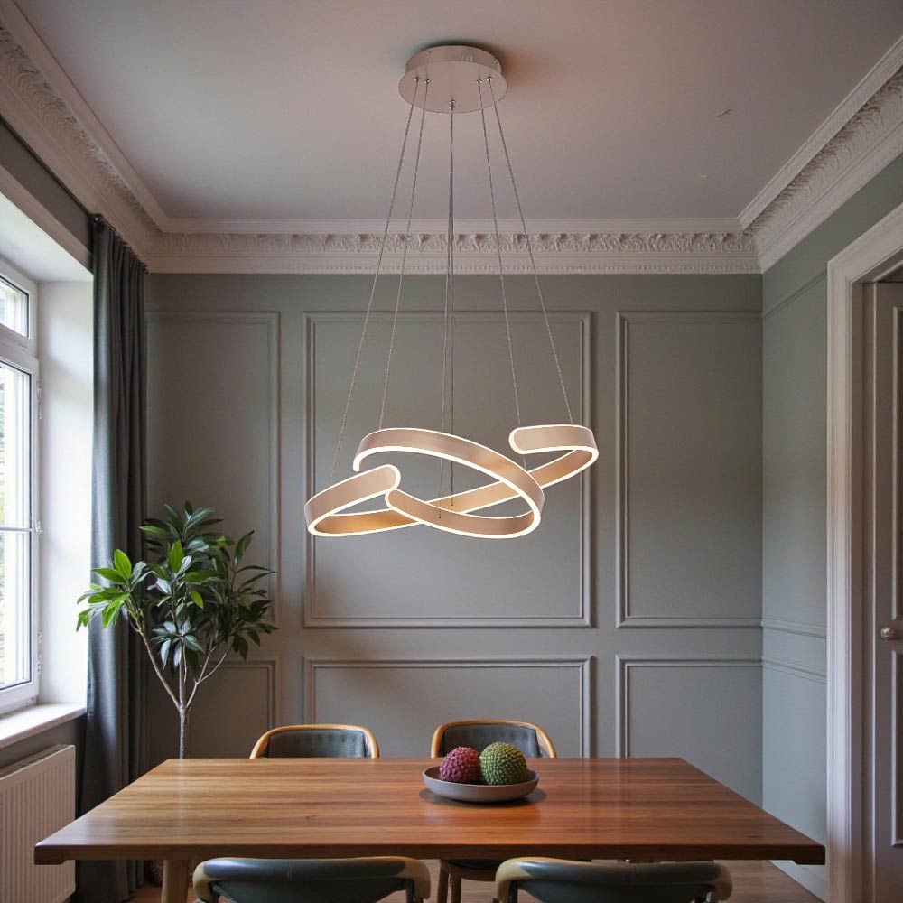 Lámpara colgante LED moderna con un diseño de espiral o cinta entrelazada. Presenta un diseño artístico y contemporáneo. Utiliza iluminación LED integrada, lo cual es eficiente energéticamente y de larga duración. Fabricada con una combinación de metal y acrílico o silicona para la cubierta difusora de la luz. Ofrece la posibilidad de ajustar la temperatura del color (luz cálida, neutra o fría) e incluso es regulable(dimables) mediante la app Dexel Smart, Smart Life o Tuya. Es ideal para añadir un punto focal decorativo y moderno en espacios interiores como salas de estar, comedores, dormitorios u oficinas.