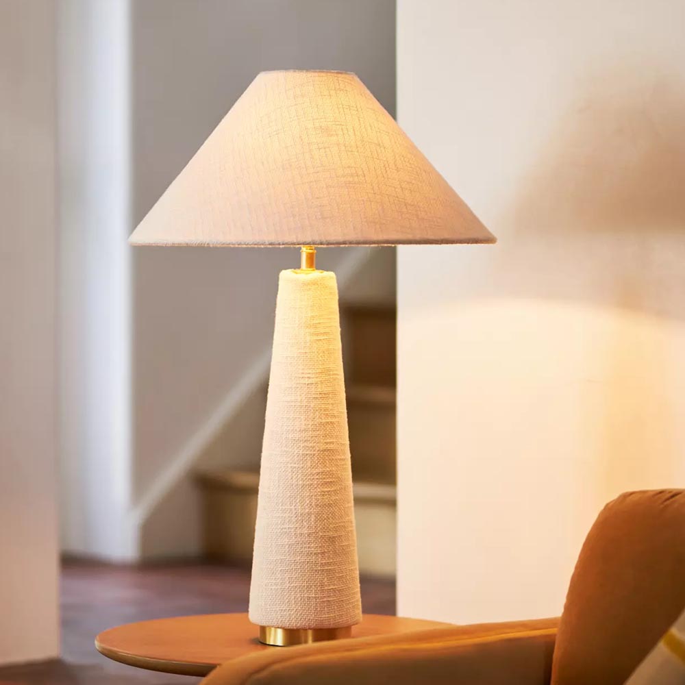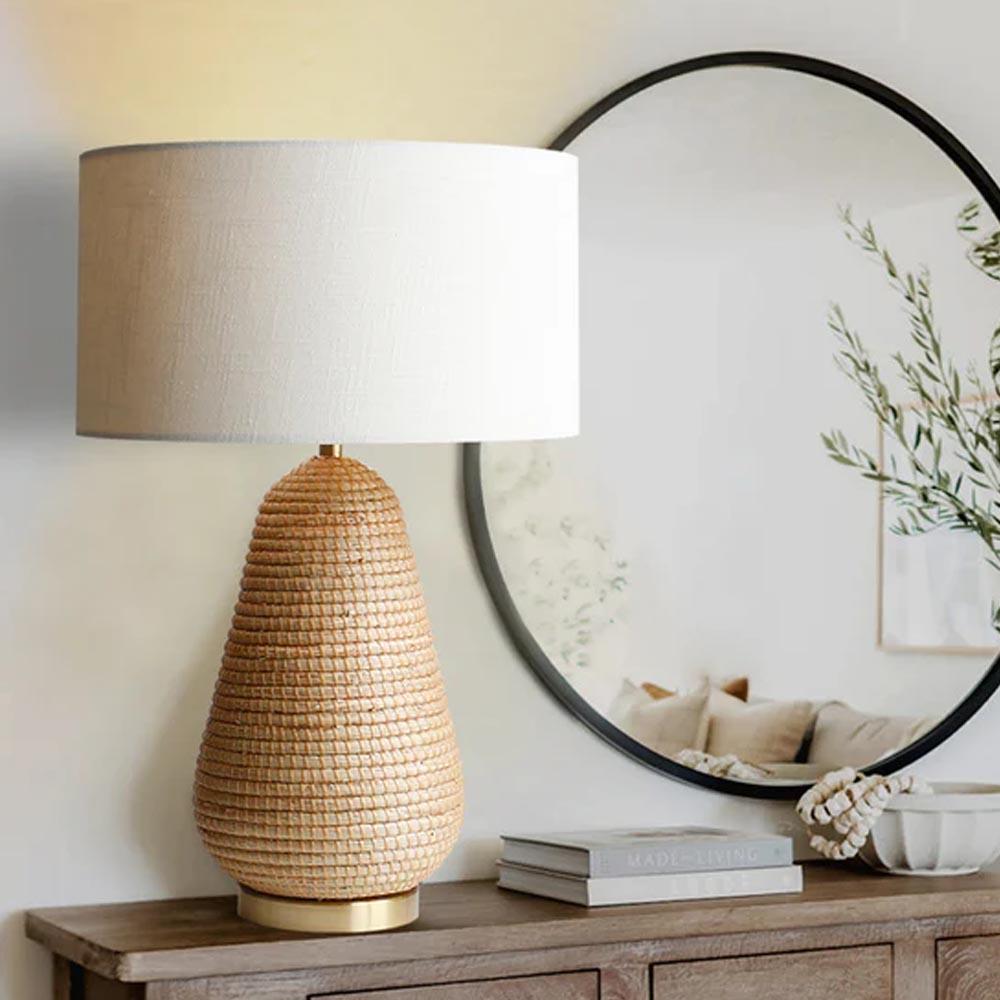 Lámpara de mesa con un diseño rústico y elegante. Posee una base de trípode en color negro, lo que le confiere estabilidad y un toque moderno. La pantalla es de ratán, un material que permite que la luz se filtre a través de sus pequeños orificios, creando un efecto de luz cálido y atmosférico. El diseño general de la lámpara combina elementos rústicos con un toque de lujo, haciéndola versátil para diversos espacios como salas de estar, dormitorios o incluso hoteles.
