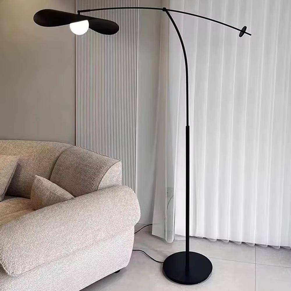 Lámpara de pie moderna con un diseño minimalista. Consiste en una base circular oscura de la que se eleva un poste vertical negro. De este poste, en la parte superior, se extiende una sección horizontal que se dobla hacia abajo, formando una estructura en forma de "U" invertida. Paralelo al poste vertical principal, cuelga un tubo de luz LED vertical que emite una luz cálida y brillante.