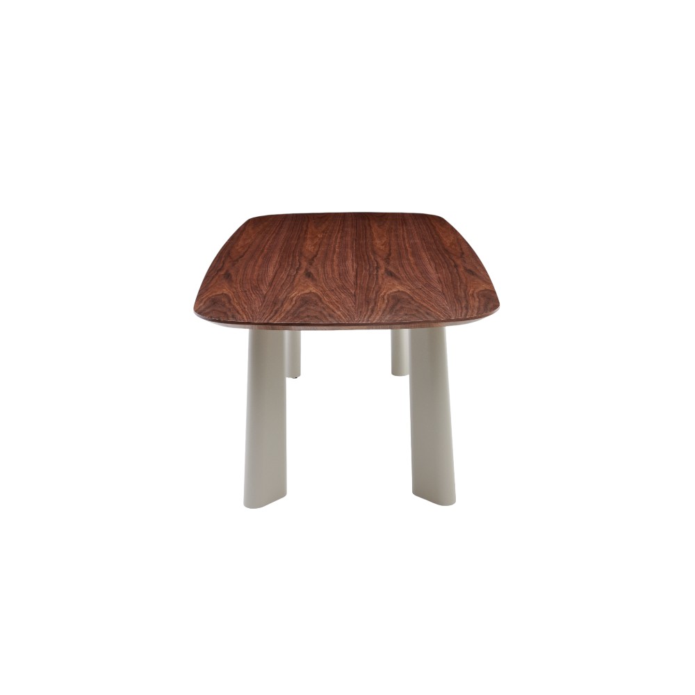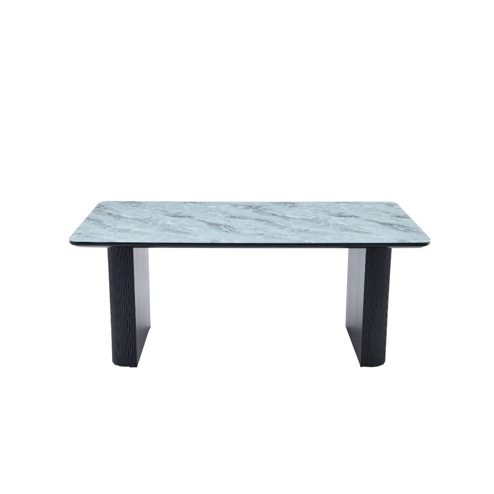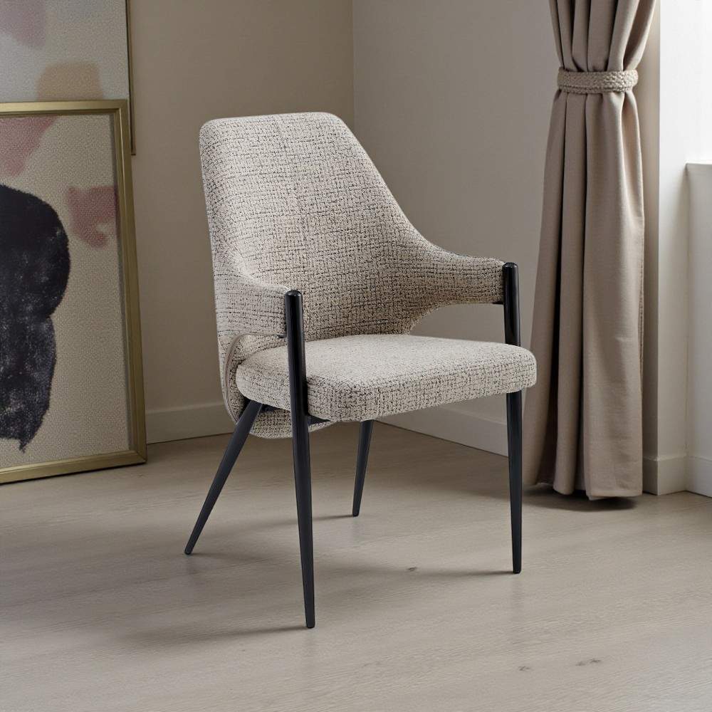 Silla de comedor individual de color claro, tapizada en cuero sintético (PU), con un acabado liso y un ligero brillo. El respaldo es alto y ligeramente curvado, con un diseño de costuras verticales acanaladas que le dan un aspecto elegante y texturizado. El asiento es acolchado y de forma rectangular, proporcionando comodidad. Las patas son delgadas y cilíndricas, de metal en un color que combina con el tapizado de la silla, y se estrechan ligeramente hacia el suelo. El diseño general de la silla es moderno y minimalista, adecuado para un comedor contemporáneo.