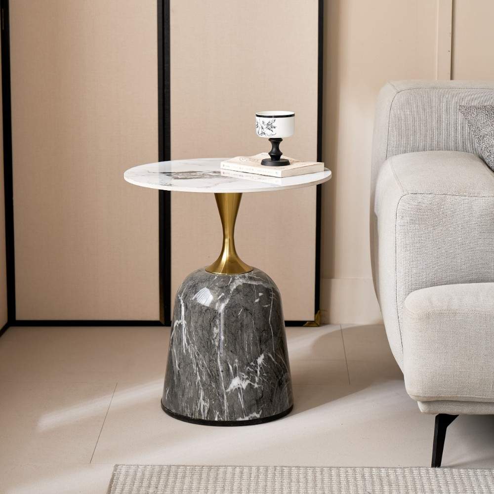 Mesa de centro/auxiliar fabricada con una tapa de piedra sinterizada que imita el mármol, y una base de metal en acabado dorado y piedra sinterizada tipo mármol gris. Diseño: Presenta un diseño moderno y elegante con una tapa redonda y una base cónica de tipo mármol gris que se estrecha hacia una sección dorada. Esta mesa es una opción popular por su estilo distintivo que combina acabados de lujo a un precio accesible, ideal para salas de estar o dormitorios. Parte superior: piedra sinterizada de 12 mm