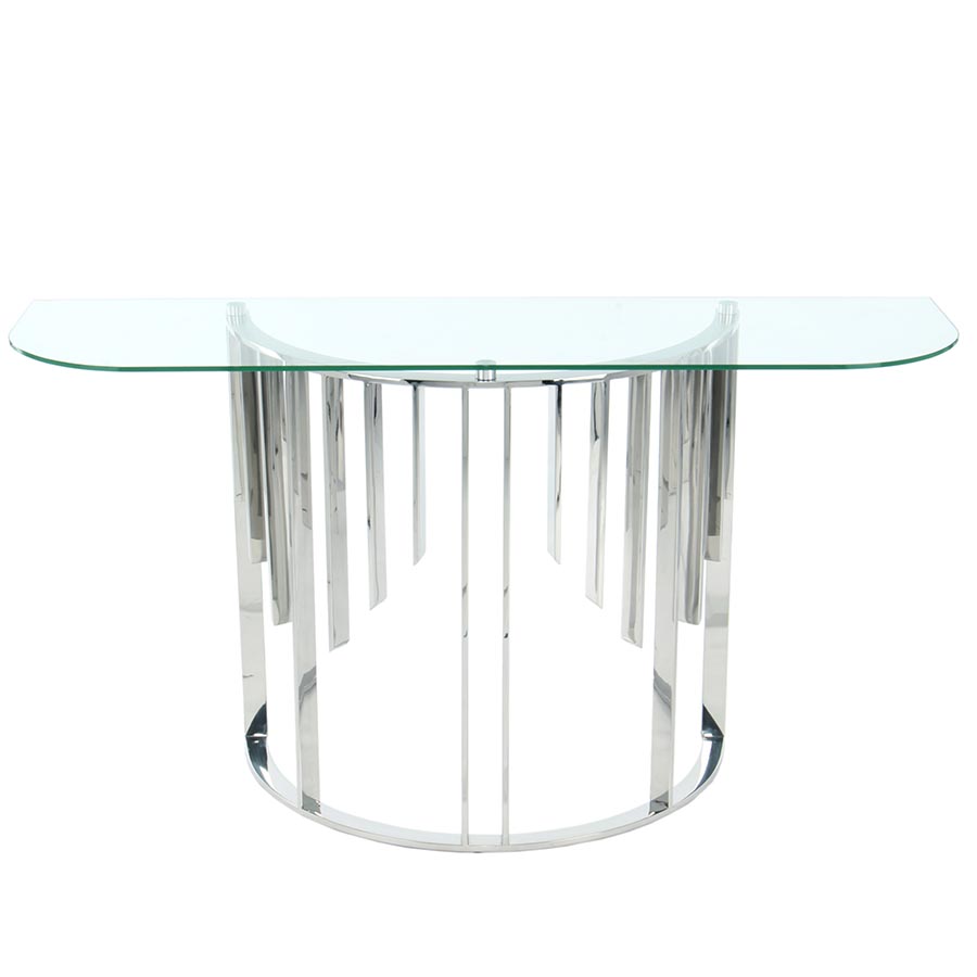 Consola de estilo moderno con un diseño elegante y contemporáneo. Cuenta con un top de cristal transparente, con una forma semicircular o de media luna que le confiere un aspecto distintivo. La base está elaborada con múltiples barras o listones de metal pulido, probablemente acero con acabado cromado o plateado, dispuestas verticalmente y curvadas en la parte inferior para formar una base sólida y estéticamente atractiva. Este diseño de la base le otorga un aspecto escultórico y reflectante. El conjunto de la mesa irradia un atractivo glamuroso y sofisticado, ideal para entradas, pasillos o como mesa auxiliar en salas de estar, ofreciendo un espacio para exhibir objetos decorativos o almacenar elementos esenciales.