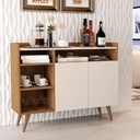 • Aparador Buffet de estilo retro diseñado frecuentemente para crear un "rincón del café" en el hogar. • Este modelo específico cuenta con dos puertas, estantes abiertos (nichos) para organización y patas estilo "palito". • Material: Fabricado principalmente en MDP y MDF con acabado mate. • Dimensiones: 108 cm de ancho, 35 cm de profundidad y una altura de 97 cm. • Configuración: Posee dos puertas con bisagras metálicas y tres estantes internos/externos para almacenamiento. • Requiere armado.